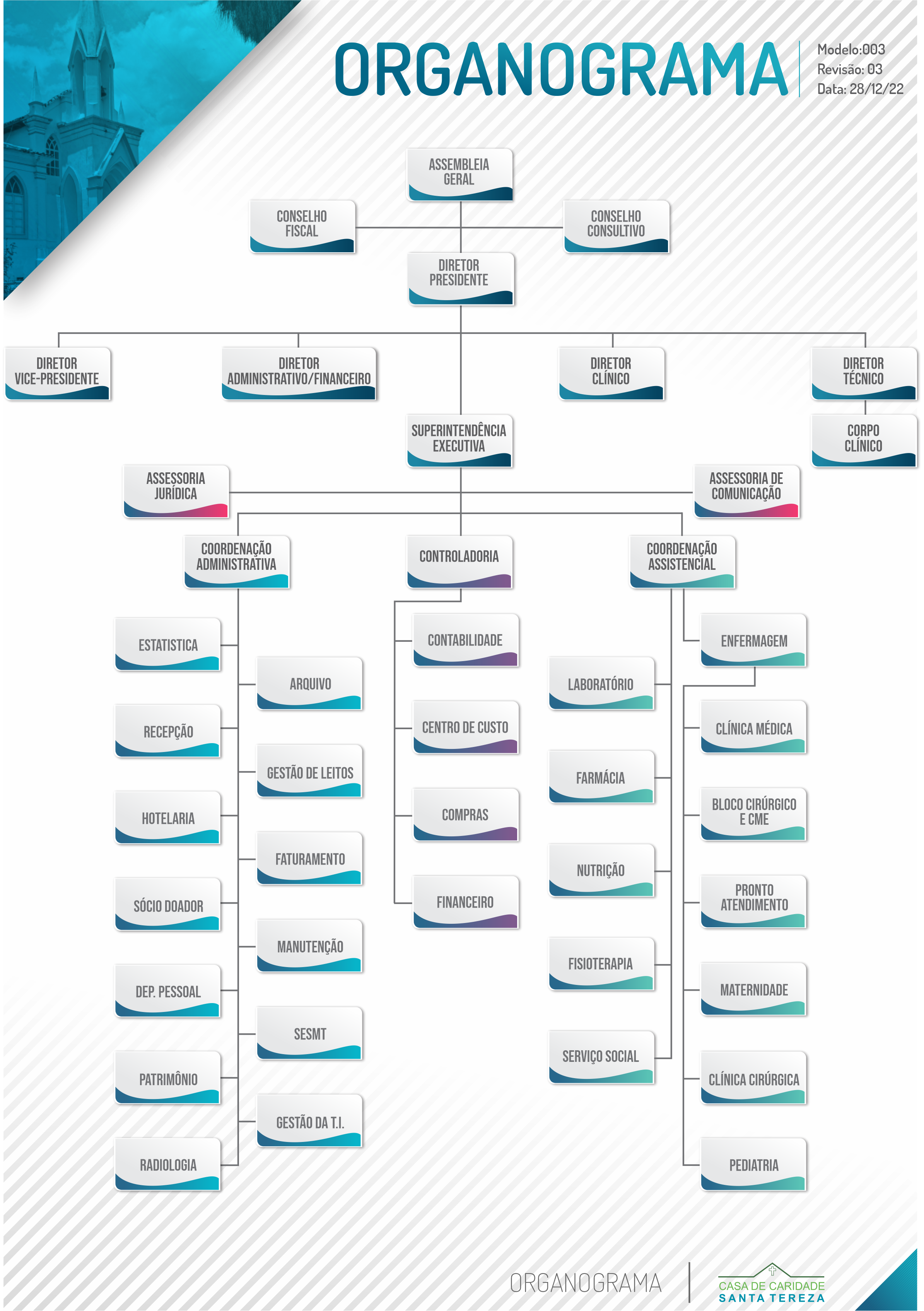 Como parte fundamental da modernização de gestão, a Casa de Caridade Santa Tereza está com uma estrutura organizacional que permite agilidade nos processos de tomada de decisão, fluidez de informação, e principalmente autonomia setorial. Áreas assistenciais, administrativas e de apoio trabalham com independência, e ao mesmo tempo com uma comunicação integrada, onde cada uma realiza contratos com as demais que direta ou indiretamente interferem em seu setor. O organograma foi atualizado de acordo com uma modelagem moderna, de modo a refletir a atual realidade da organização. A seguir, nosso organograma atual: