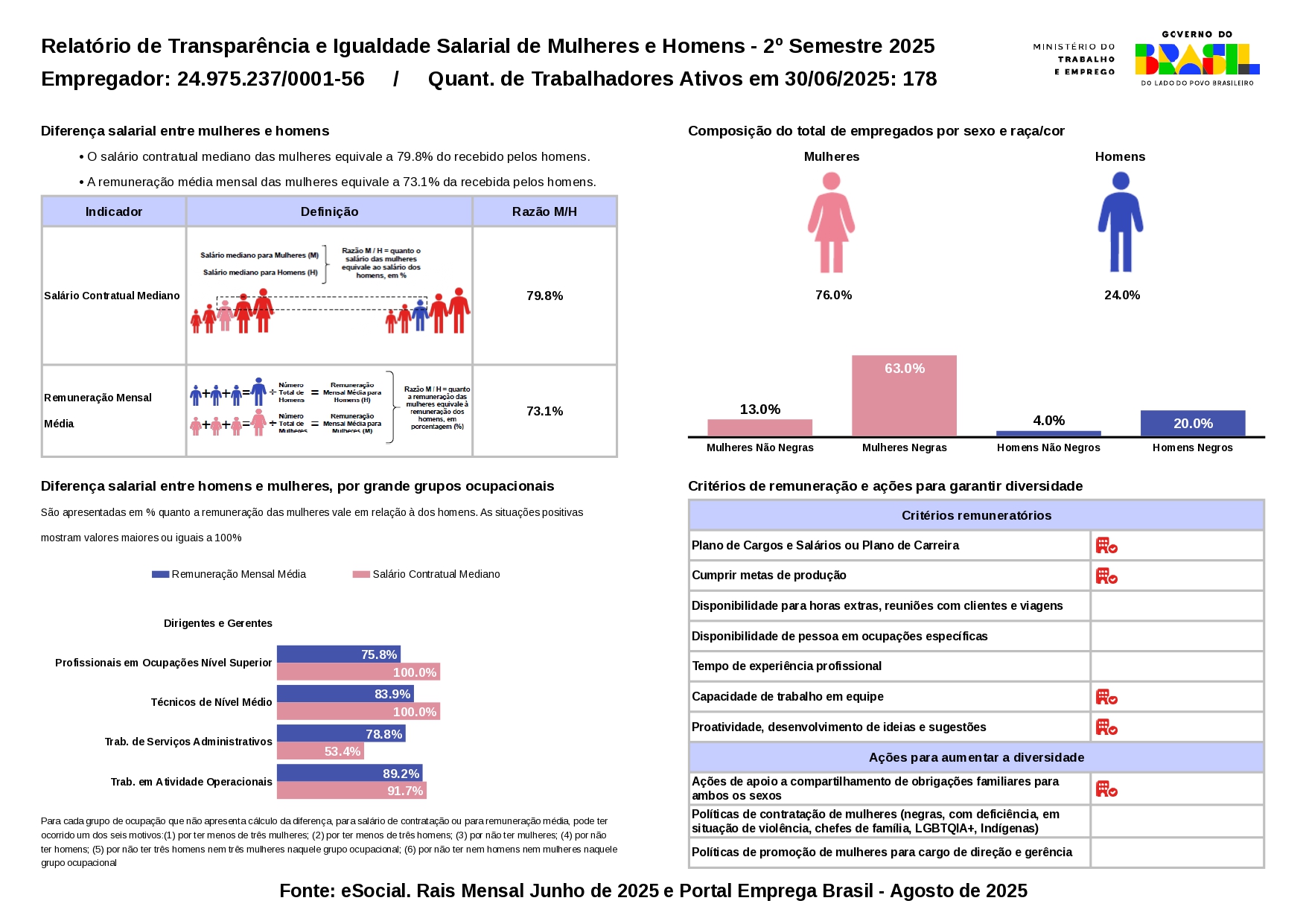 O “Relatório de Transparência e Igualdade Salarial de Mulheres e Homens” do governo federal brasileiro é um instrumento instituído pela Lei nº 14.611, de 3 de julho de 2023, que busca dar visibilidade às diferenças de remuneração entre mulheres e homens no ambiente de trabalho, bem como aos critérios remuneratórios adotados pelas empresas.